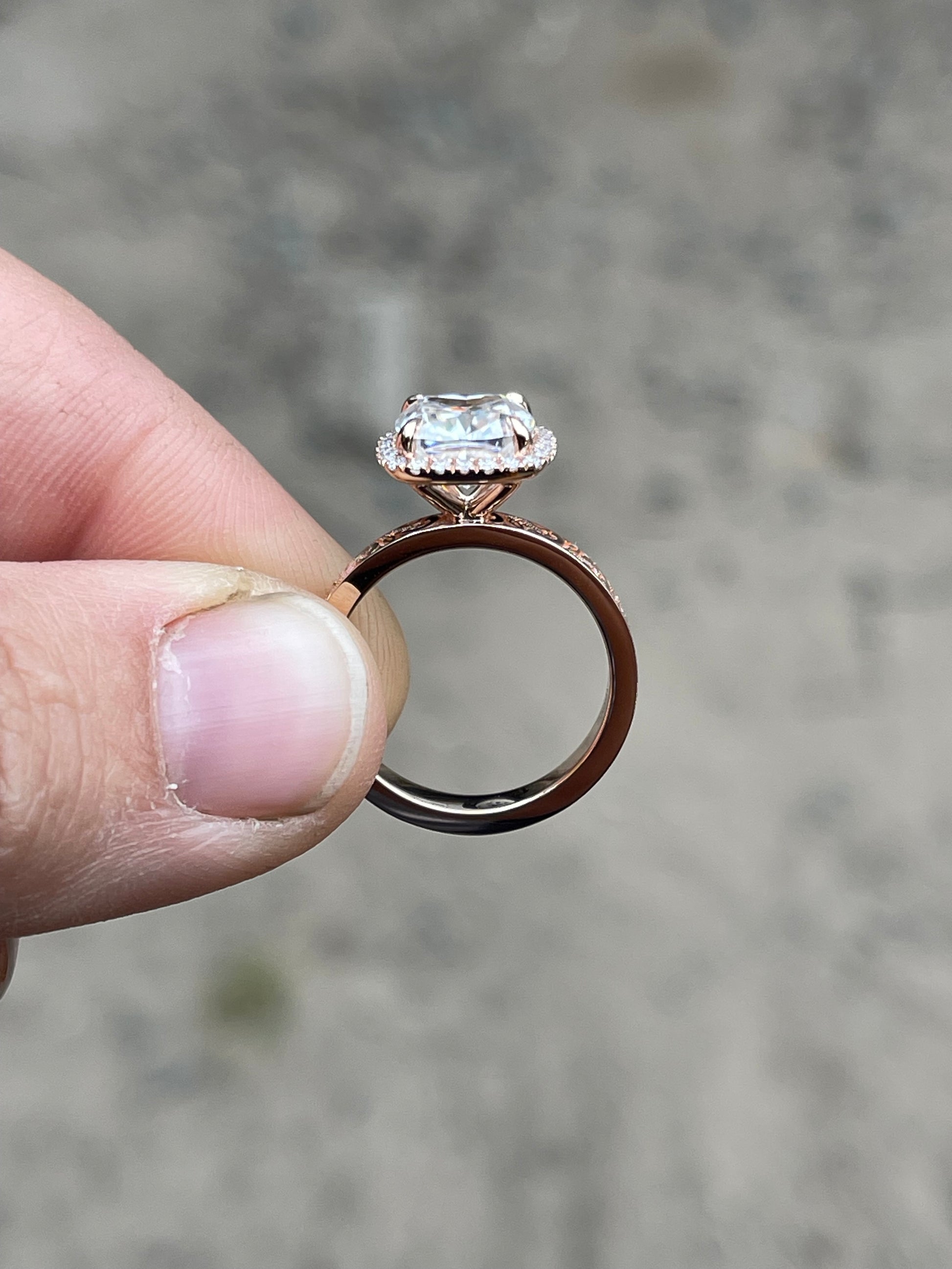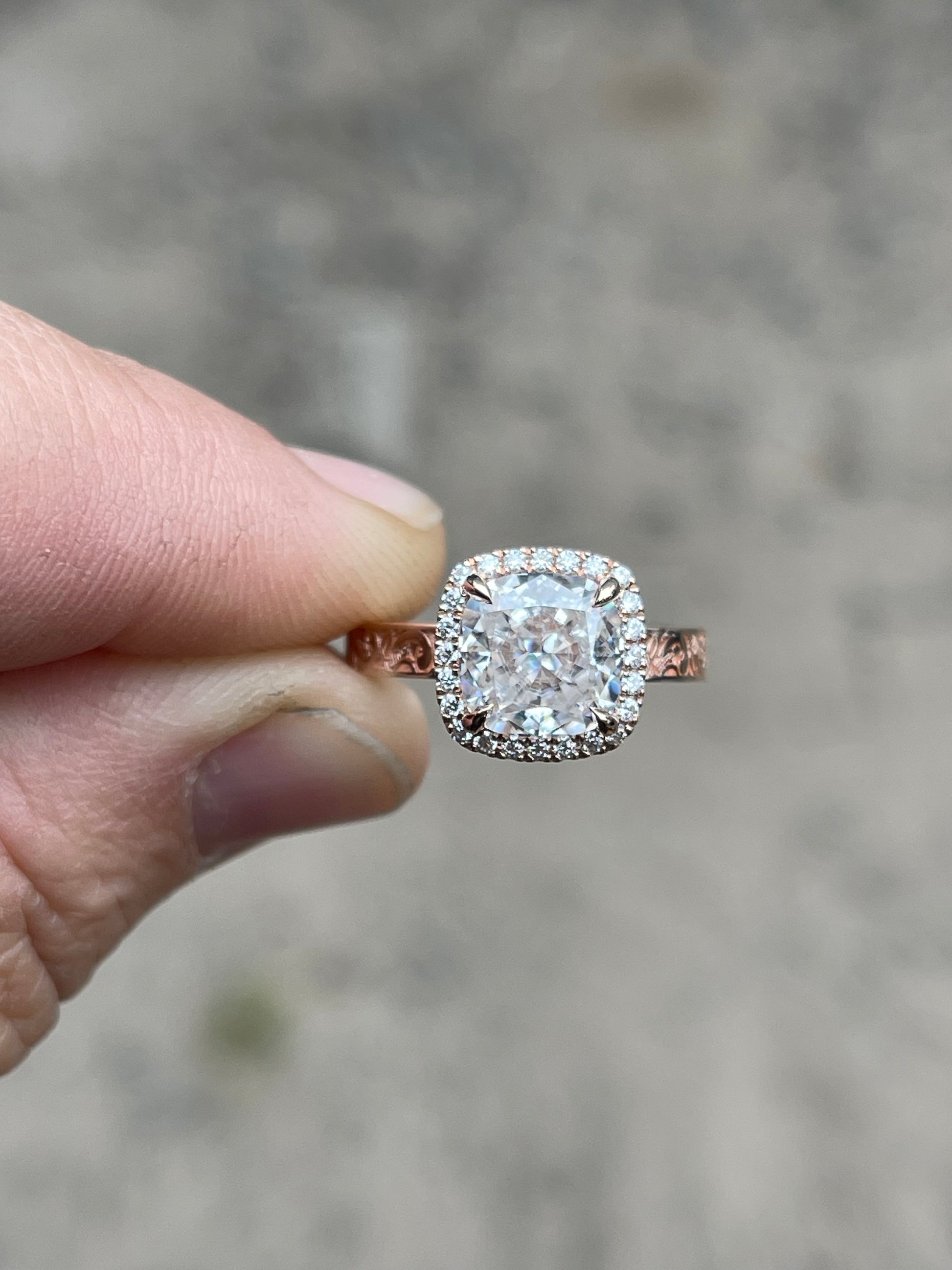 3ct Cushion Cut LAB DIAMOND AND LAB DIAMOND Halo on a 3mm Pattern Band
