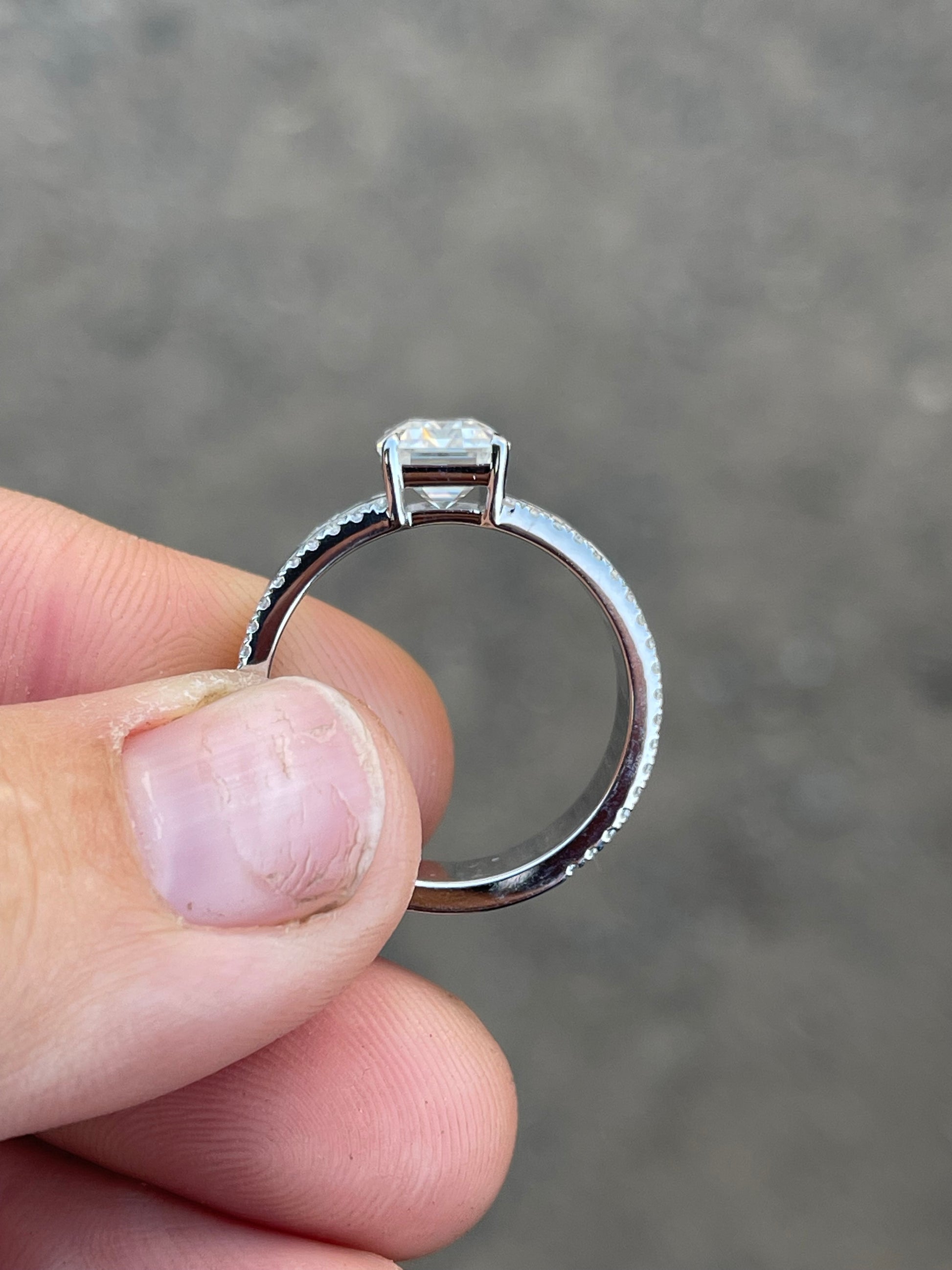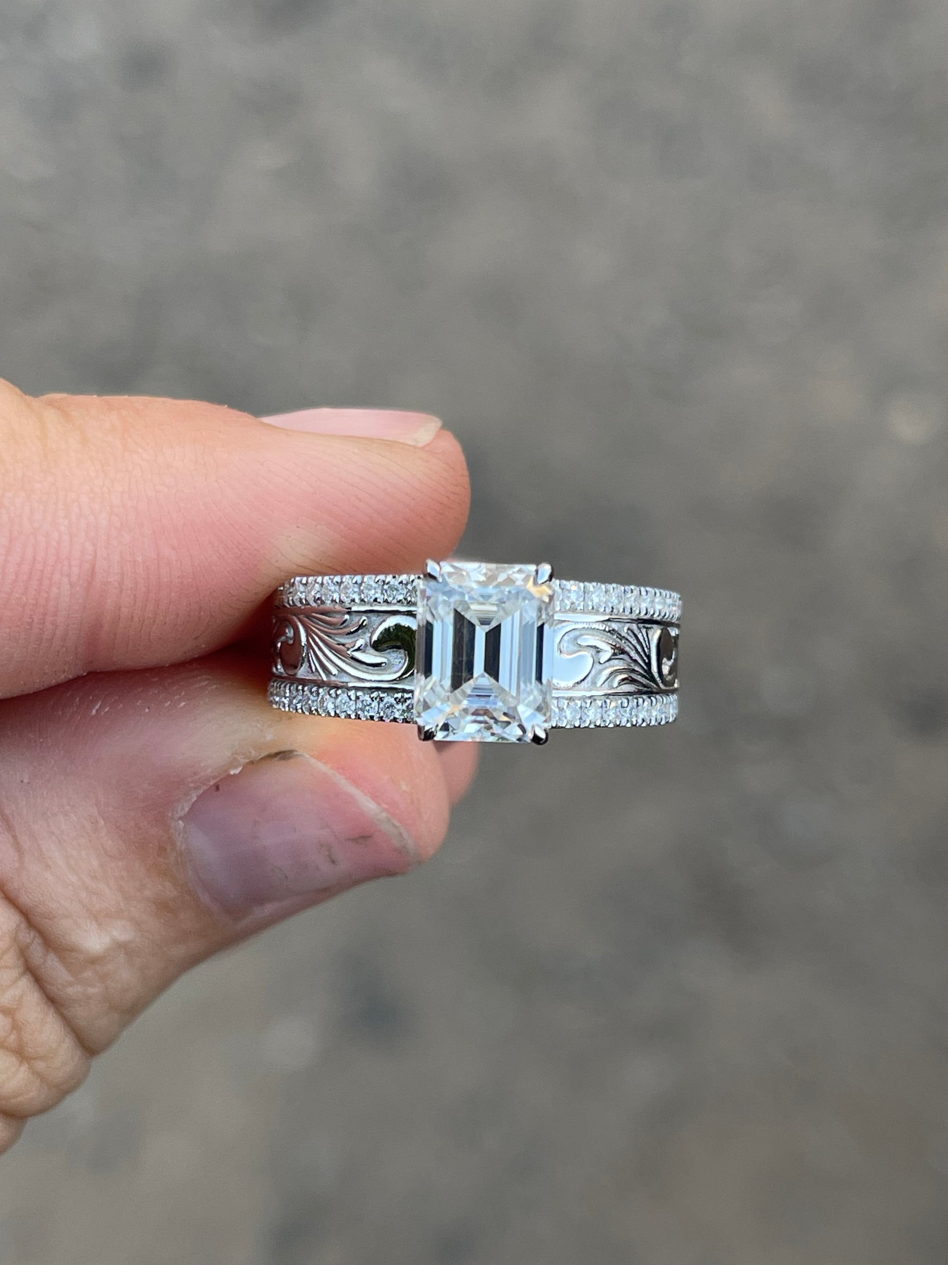 3ct Emerald Cut Moissanite with 5mm to 3mm Tapered Pattern Band with Stones.