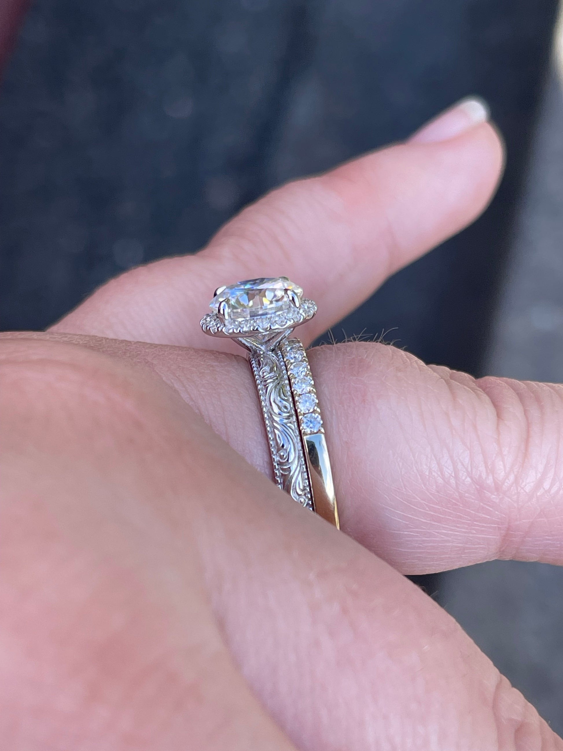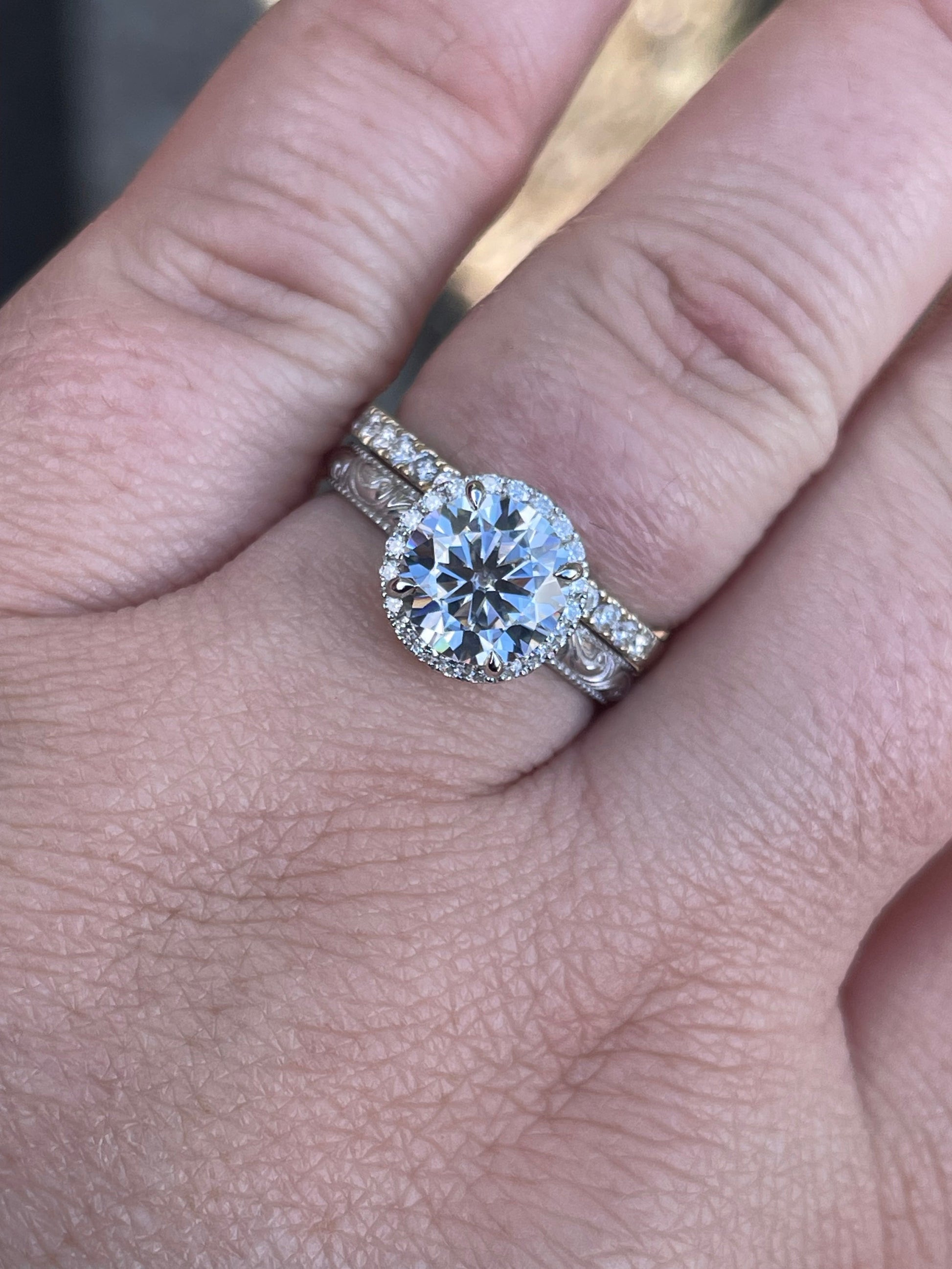 3Ct Round Cut Moissanite 9mm with Halo Moissanite Stones on 3mm Pattern Band